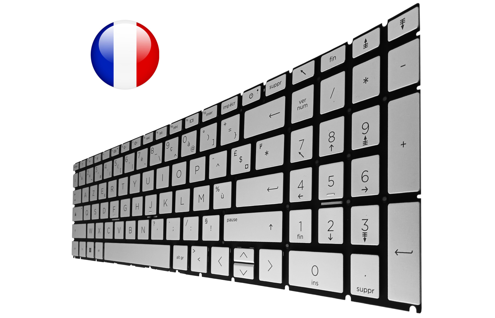 Clavier argenté pour ordinateur portable de marque HP, Français (AZERTY).