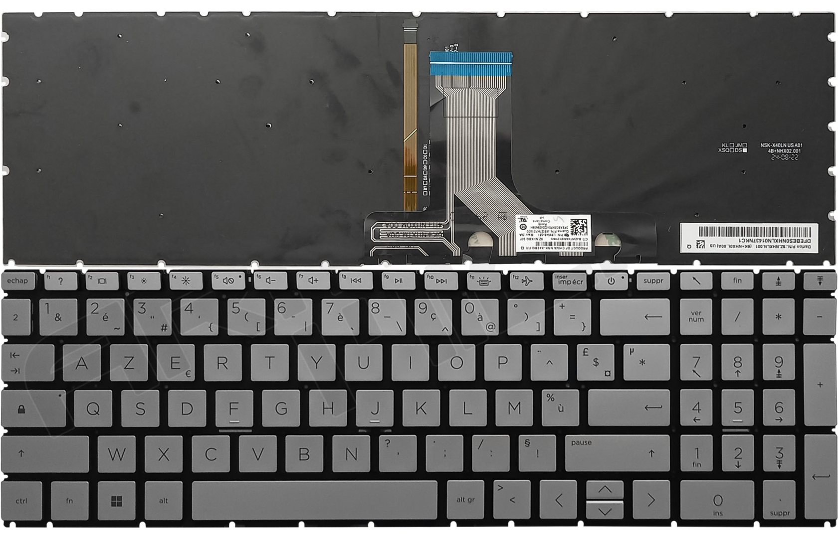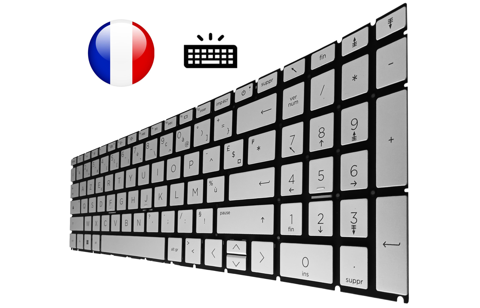 Clavier argenté pour ordinateur portable de marque HP, Français (AZERTY).